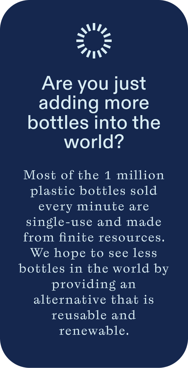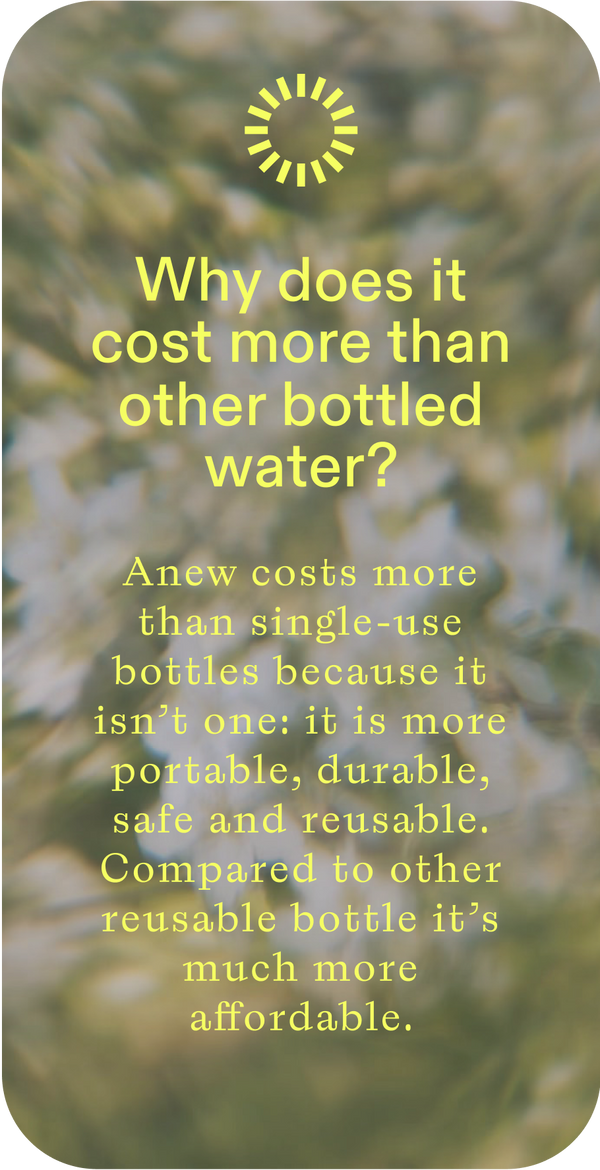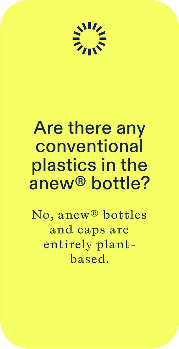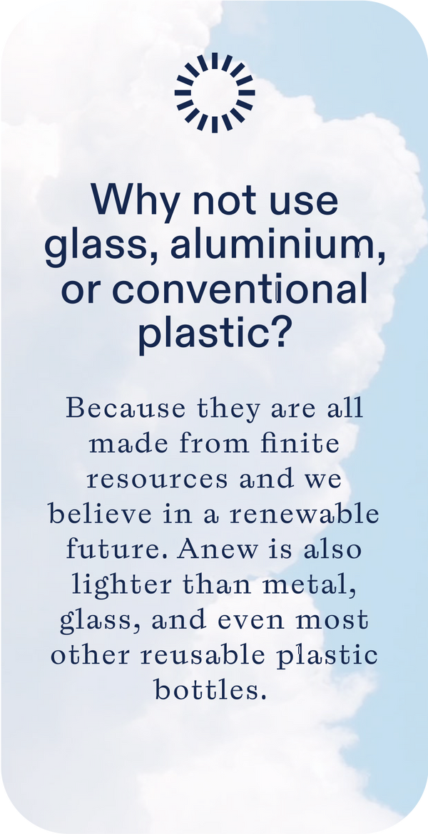 Compared to glass we’re lighter — and more durable, and produced with a lower carbon footprint. We’re kinder than traditional plastic, because we’re made from plants, not oil. And unlike aluminium bottles or cans, anew bottles are mono-material and do not need a plastic lining.